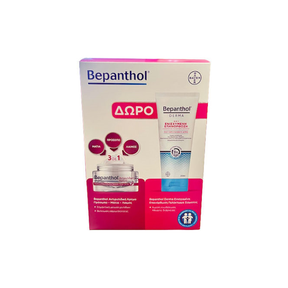 Η Bepanthol® Αντιρυτιδική κρέμα για πρόσωπο, μάτια & λαιμό μειώνει σημαντικά τις ρυτίδες, βελτιώνει τη σφριγηλότητα θρέφει, προσφέρει λάμψη και ενυδάτωση.Χάρη στο συνδυασμό του εκχυλίσματος λιπιδίων Juvenessence®, πεπτιδίων, βιταμινών Α & Β5 και λιπαρών οξέων που περιέχει θα έχετε ορατά αποτελέσματα μείωσης των ρυτίδων σε μόλις 28 ημέρες!Με το εκχύλισμα Juvenessence® που περιέχει, επιδρά ανασταλτικά στην παραγωγή πρωτεϊνών που σχετίζονται με τη γήρανση του δέρματος, ενώ με το ειδικό μίγμα πεπτιδίων, ενισχύει την παραγωγή κολλαγόνου στο δέρμα με αποτέλεσμα όχι μόνο λιγότερες ρυτίδες, αλλά και βελτιωμένη ελαστικότητα, σφριγηλότητα και υφή.