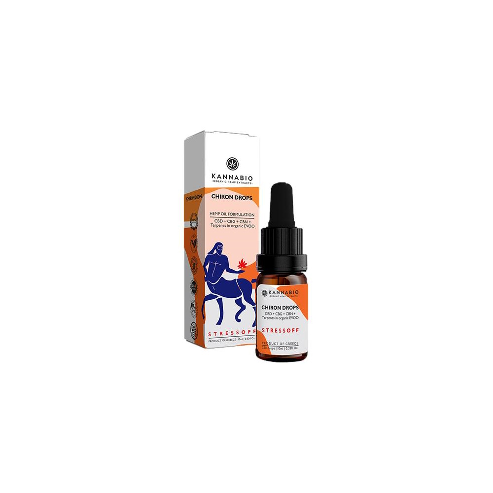 Το Chiron Drops Stressoff περιέχει CBD 10%, CBN 5%, CBG 2.5% και ένα μείγμα Τερπενίων (αρωματικών ενώσεων) αποκλειστικής σύνθεσης (Beta-Caryophyllene, Linalool, Terpinolone, Beta-Myrcene) για την ενίσχυση της δράσης των κανναβινοειδών στην μείωση του άγχους, του στρες και των κρίσεων πανικού.