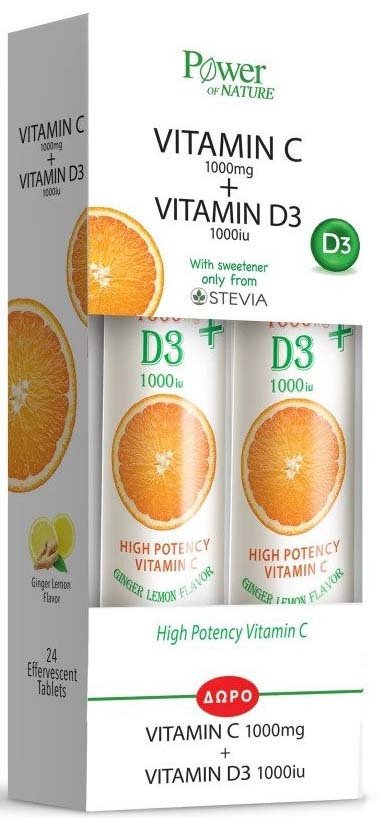 Power Vitamin C 1000Mg & D3 1000Iu Stevia 24S Αναβράζουσα Promo (1+1 Δώρο)
