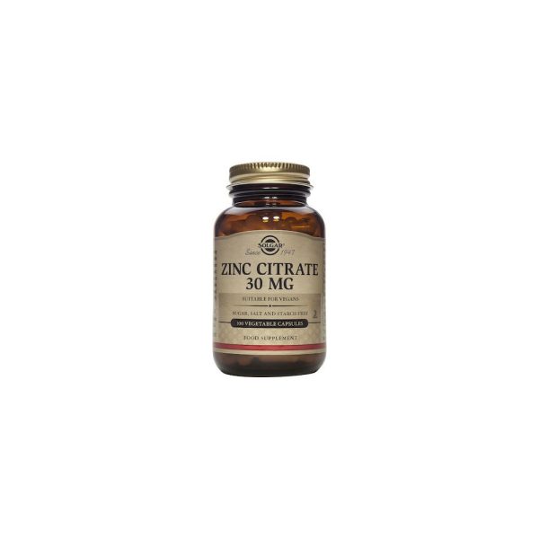 Το Solgar® Zinc Citrate 30 mg Vegetable Capsules παρέχει εξαιρετικής ποιότητας ψευδάργυρο σε εξαιρετικά απορροφήσιμη μορφή.Ο ψευδάργυρος είναι βασικό θρεπτικό συστατικό και απαραίτητο ιχνοστοιχείο, με ζωτικό ρόλο σε πολλές λειτουργίες του σώματος.Ο Ψευδάργυρος ενισχύει την υγεία δέρματος, μαλλιών και νυχιών, ενώ ασκεί αντιοξειδωτική δραστηριότητα που βοηθά στην αντιμετώπιση των ελεύθερων ριζών.Ο Ψευδάργυρος συμβάλλει επίσης στη διατήρηση υγιούς ανοσοποιητικού συστήματος, ενώ διαθέτει ιδιότητες χρήσιμες για την ενίσχυση ενέργειας, γονιμότητας και ανδρικής υγείας.