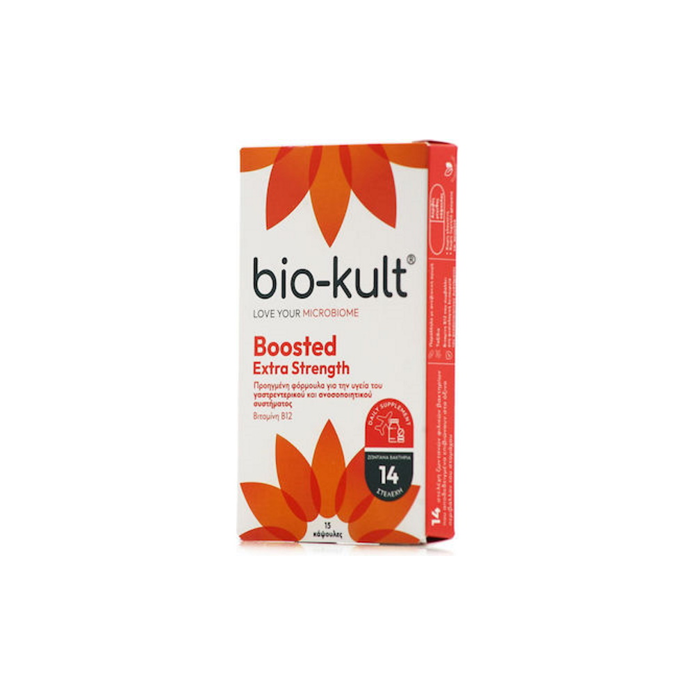 Το Bio-Kult Boosted έχει αναπτυχθεί επιστημονικά για να στοχεύει το ανοσοποιητικό σας σύστημα, καθώς και το πεπτικό σας σύστημα. Η προηγμένη μας σύνθεση πολλαπλών στελεχών περιέχει βιταμίνη Β12, η οποία συμβάλλει στη φυσιολογική λειτουργία του ανοσοποιητικού συστήματος και σας υποστηρίζει είτε λαμβάνετε αντιβιοτικά, είτε ταξιδεύετε, είτε υποστηρίζετε έναν υγιεινό τρόπο ζωής.